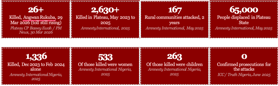 The numbers above are not from opposition politicians or partisan sources. They are from Amnesty International, which documented at least 2,630 deaths in Plateau State between May 2023 and 2025, across 167 rural communities in eight local government areas. They are from the Plateau State Government’s own acknowledgements. They are from verified media reporting going back years. Between December 2023 and February 2024 alone, Amnesty International Nigeria documented at least 1,336 people killed in Plateau State. Of those, 533 were women, and 263 were children. Over 29,000 people were displaced in that two-month window.